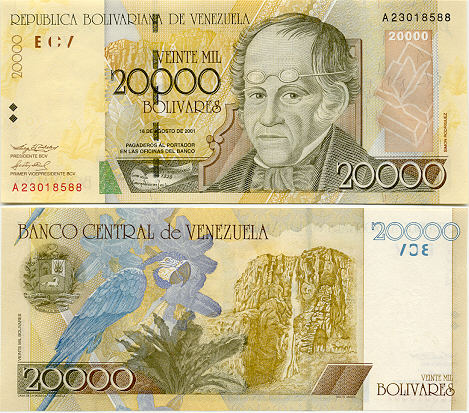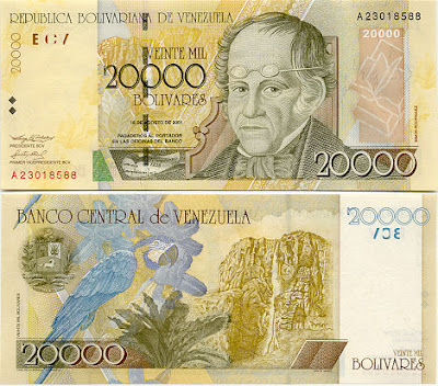 Pois é, o blogue acaba de registar 20.000 visitas. Não poderei "festejar" o acontecimento do mesmo modo como o fiz anteriormente - já não existe valor de notas de escudo que cubram todas as visitas. Mas, como a blogosfera não tem fronteiras, e o conhecimento não o deve ter também, utilizarei agora a divulgação da "arte" das notas de outras paragens, de outros países. Então aqui vai uma nota de 20.000 bolivares como símbolo e agradecimento ao leitores e participantes aqui nos blogues.
