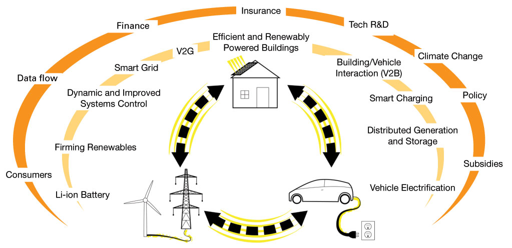 Esta proto-projecto já tem nome, chama-se Vehicle to Grid e até já tem a sua própria sigla: V2G. Apesar do V2G ainda não estar minimamente implantado, já se pensam noutros projectos que o integram e readaptam. Exemplo disso é o conceito de garagens inteligentes que pretendem, através da instalação de modo próprios de produção de energias renováveis   recarregar as baterias do veículos automóveis.